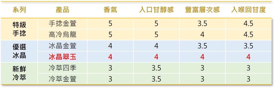 冰晶翠玉:擁有淡雅花香,茶湯清甜溫和,入喉後甘甜溫潤。